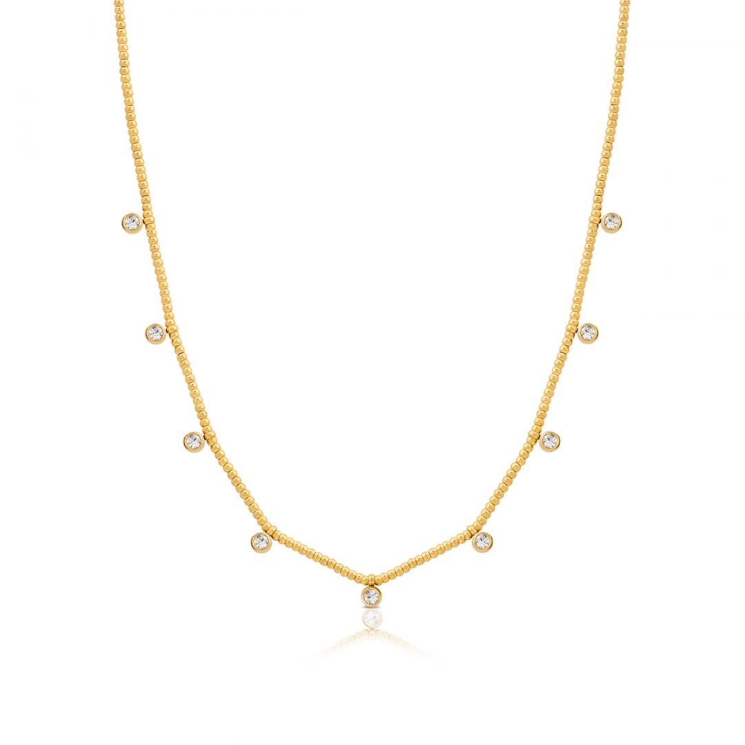 27.2NECKLACE WITH MINI POLISHED STEEL BALLS WITH YELLOW GOLD PDV TREATMENT AND WHITE STONES.