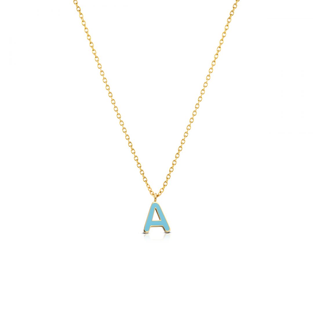Alphabet letter pendant necklace with colored enamel in polished steel with yellow gold PVD treatment. Length: 38+5 cm.