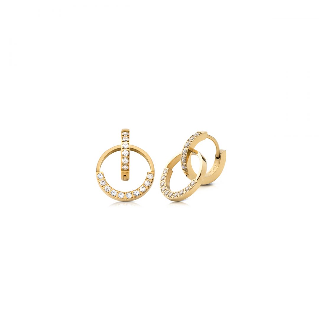 Polished steel hoop earrings with yellow gold pdv treatment. Pattern: circle and white stones.