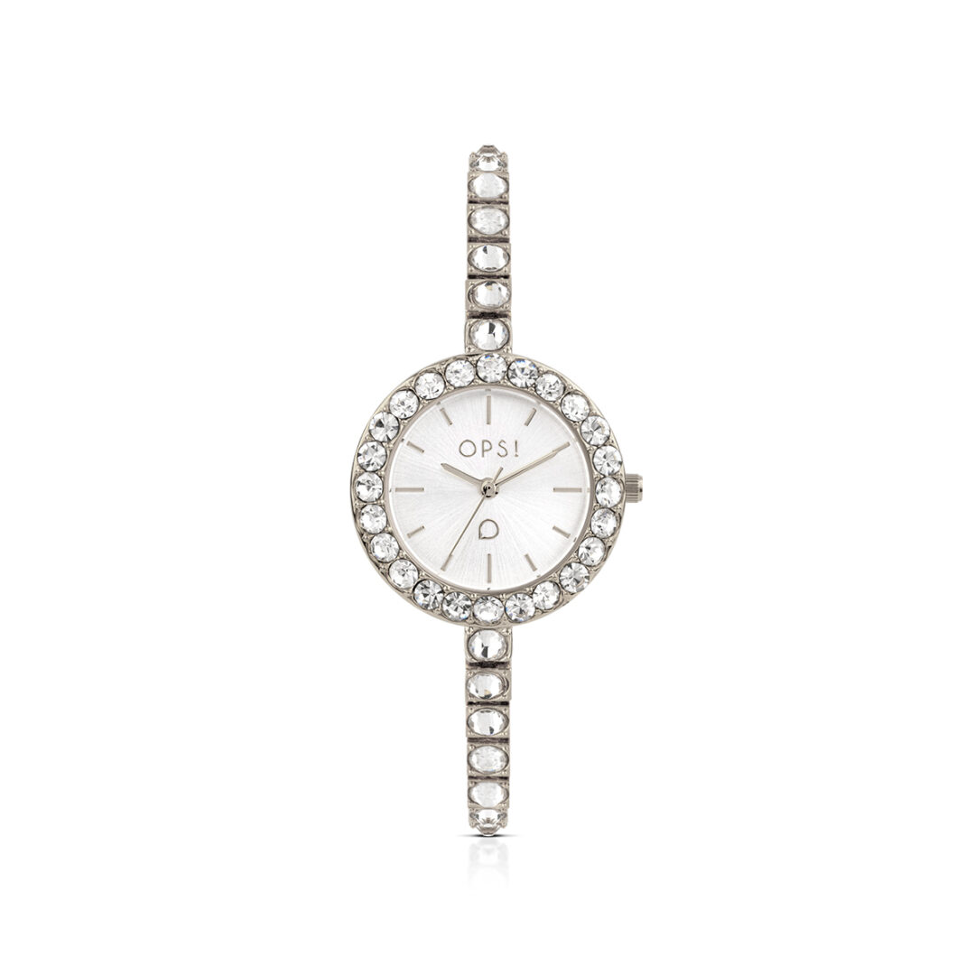 28 mm metal case with crystals and yellow gold PVD treatment. Sunray dial with crystals. Mineral glass. Steel case back. Y121 movement. Water resistant 3 atm. Metal bracelet with crystals. Bracelet width: 5/6 mm. Internal bracelet circumference: from 175 mm to 140 mm. Jewelery shop closing.