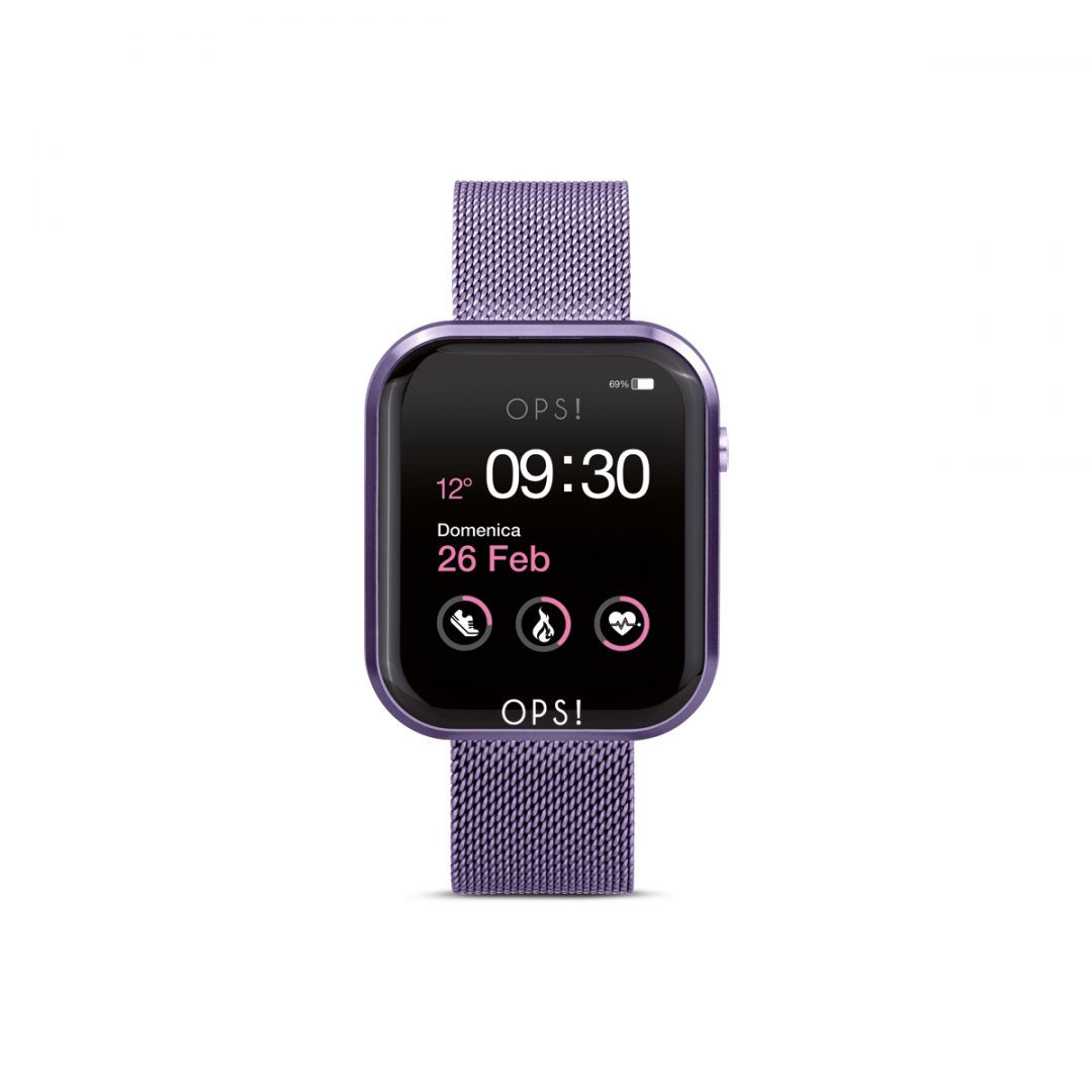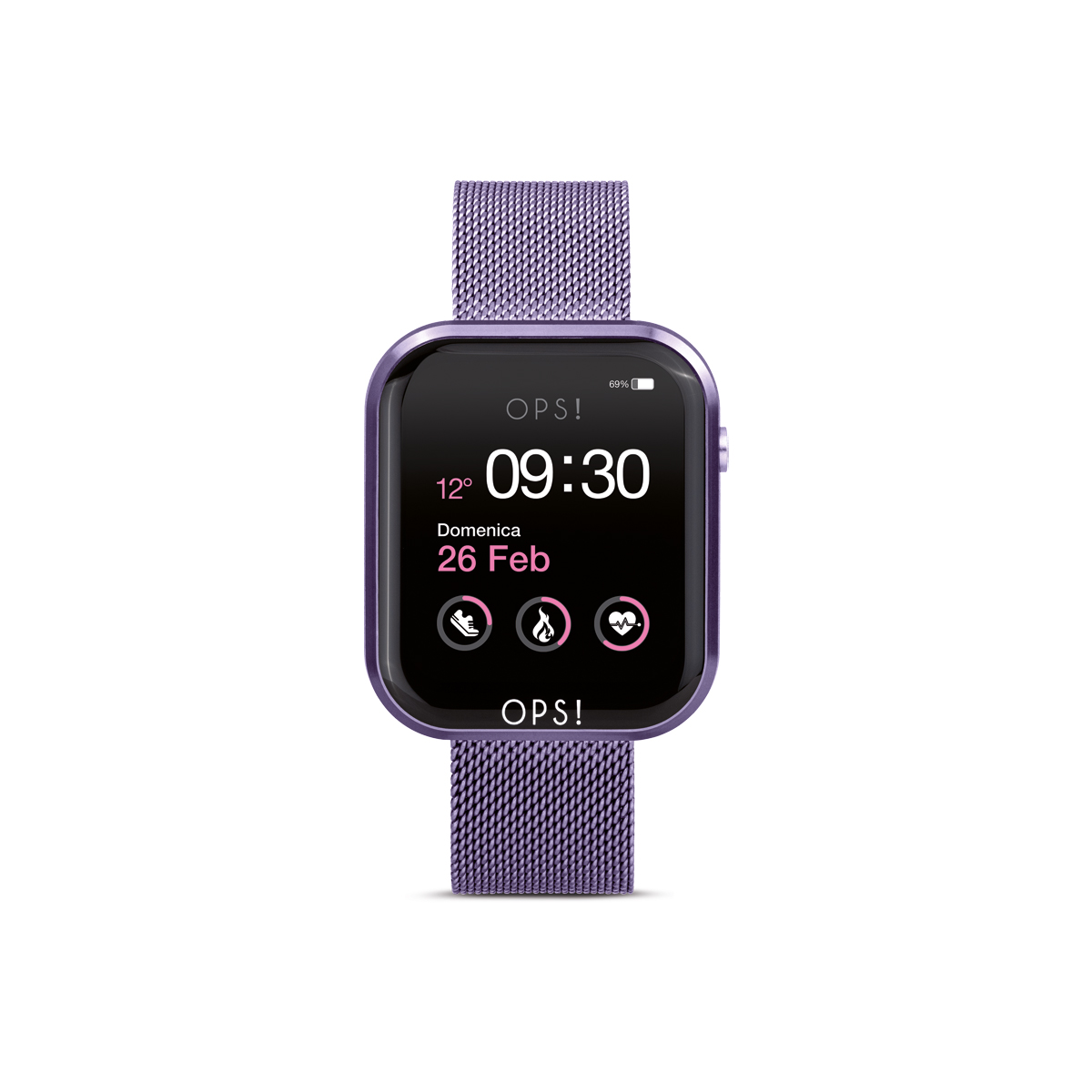 Smartwatch with aluminum and ABS case and Milan mesh bracelet in steel. Case dimensions 44x37x13 mm. 1.83” full touch color display. Band inner circumference: 180mm to 140mm. Steel sliding clasp.