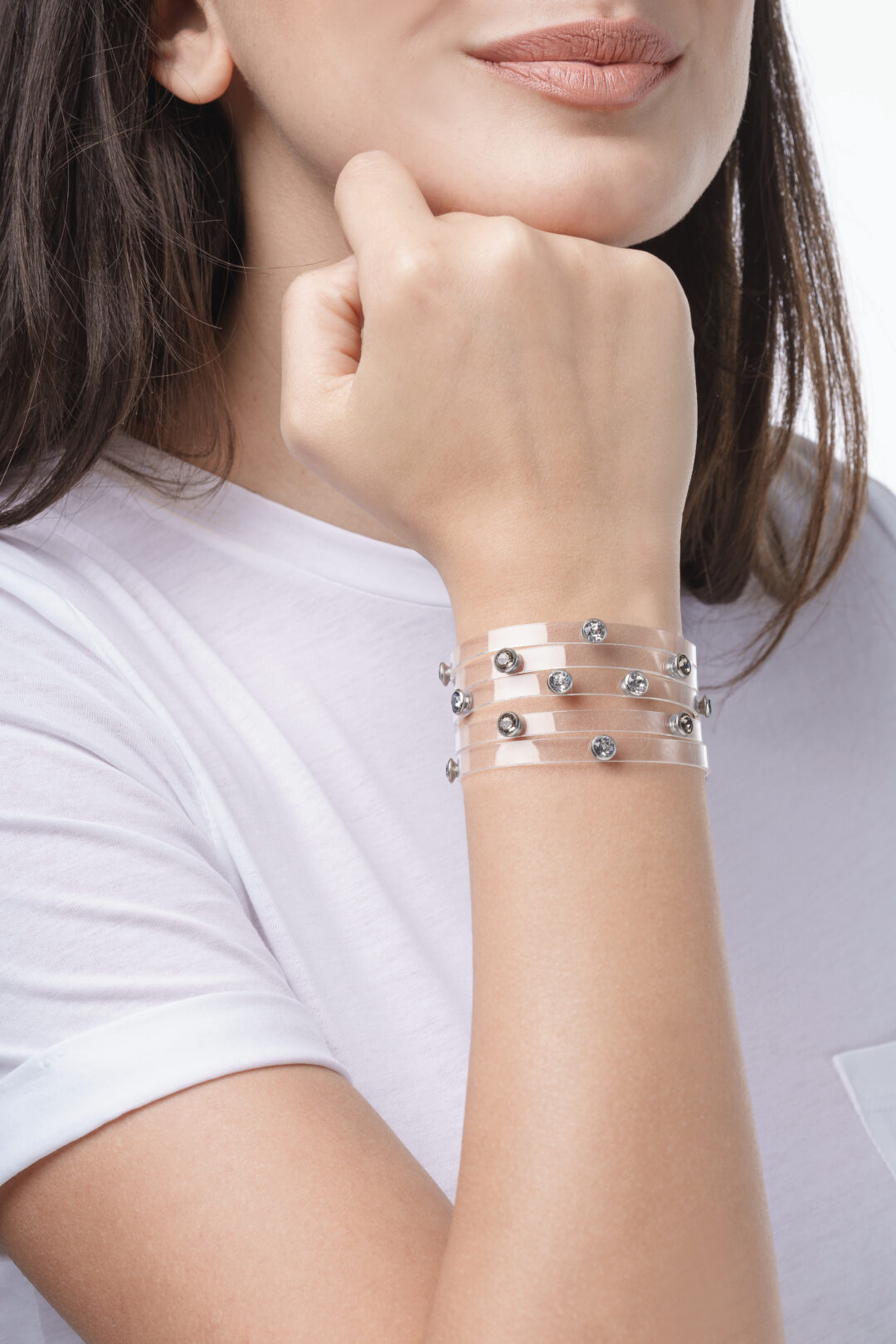 Band bracelet in transparent polyurethane and Swaroski crystals.