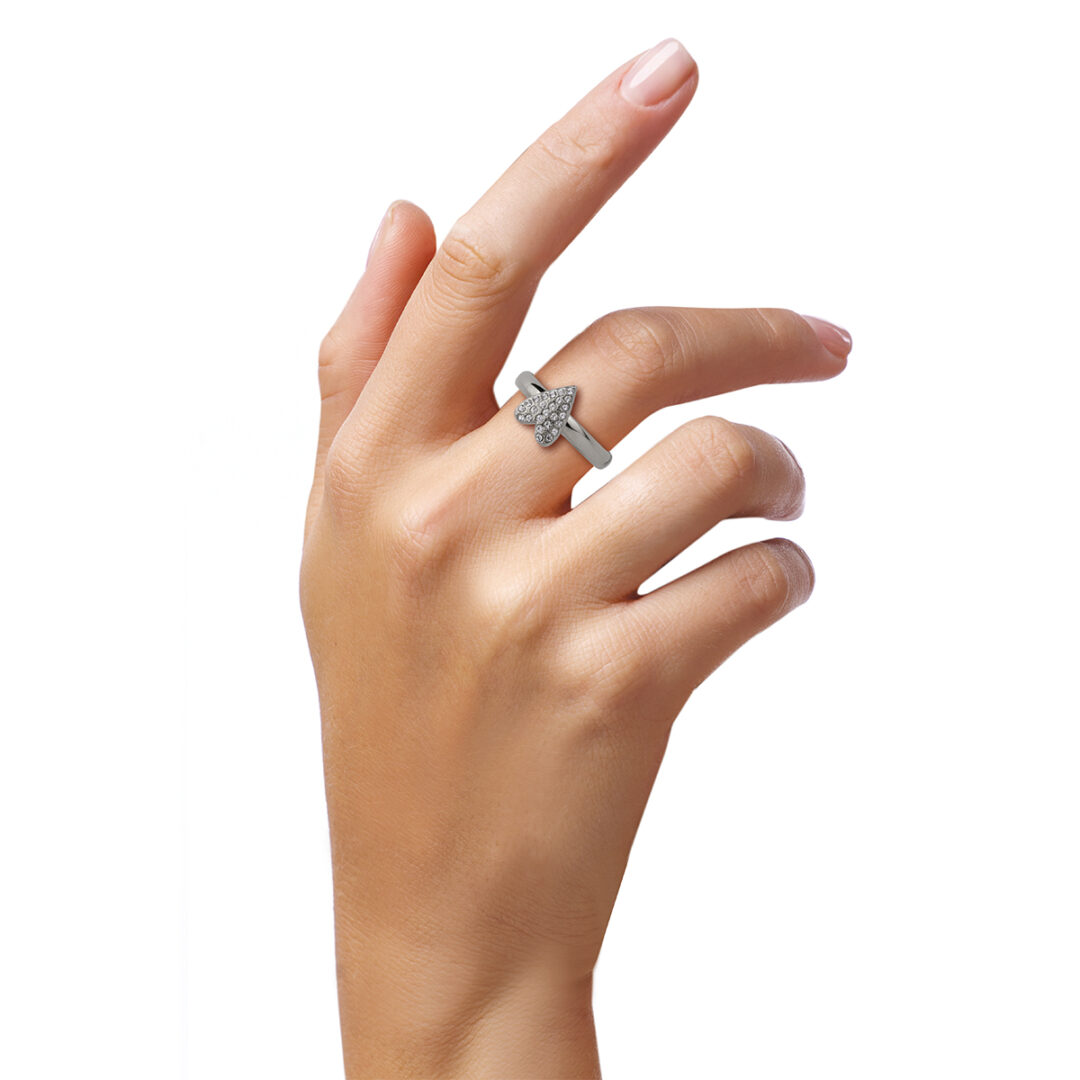 Polished steel ring with yellow gold PVD treatment. Custom OPS! heart with zircon pave. Adjustable size from 12 to 16.