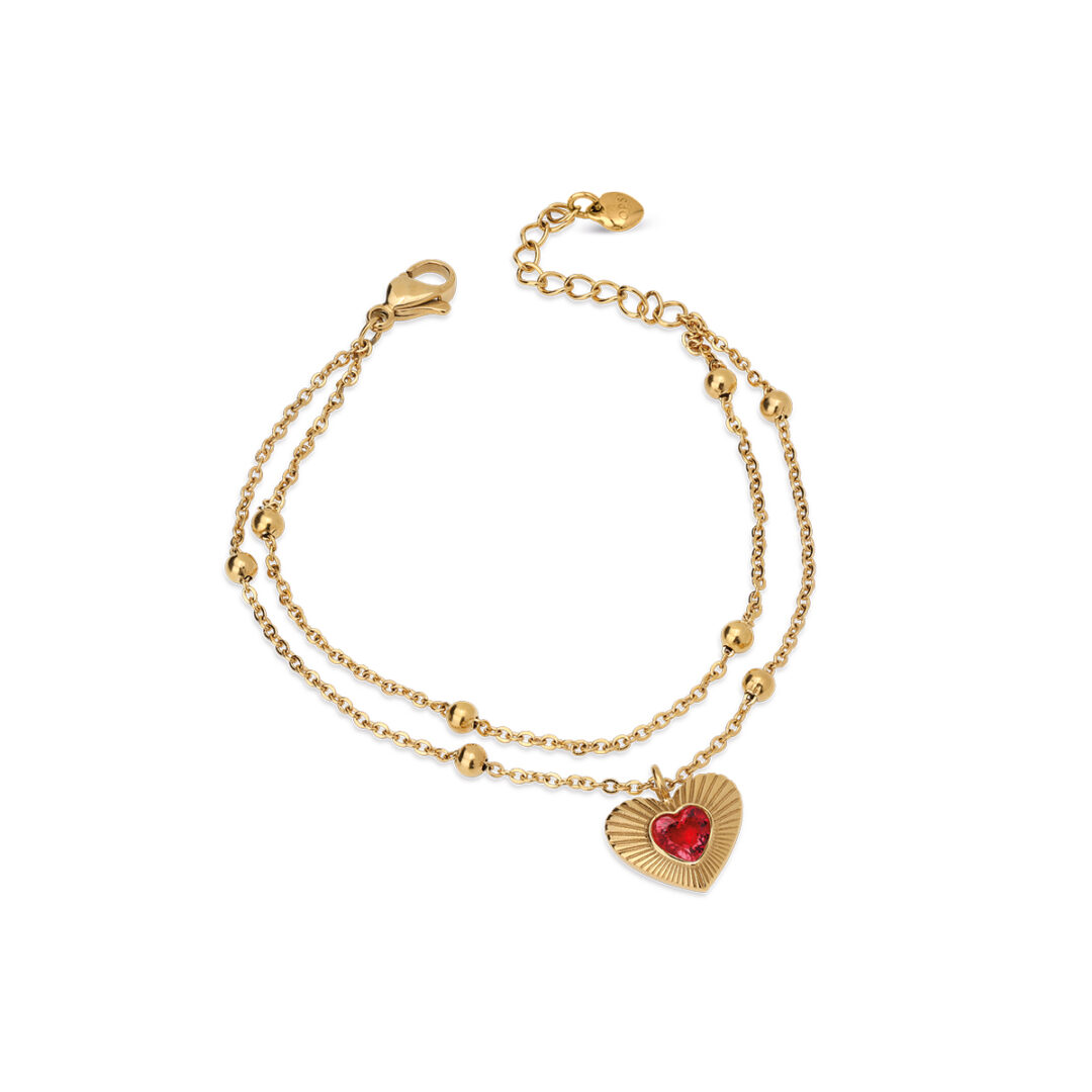Polished steel bracelet with yellow gold PVD treatment. Custom OPS! Heart-shaped pendant with white or red stone. Adjustable length from 17 to 20 cm.