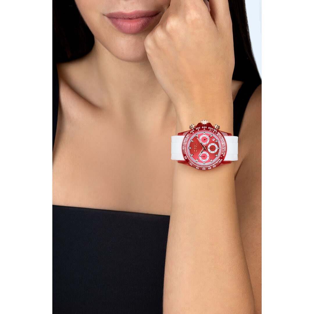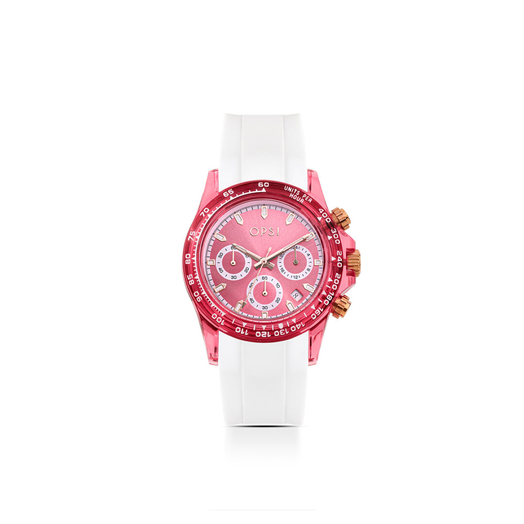 40 mm colored transparent plastic case. Sunray dial. Mineral glass. Steel case back. Chrono VD53 movement. Water resistant 3 atm. Silicone strap. Bracelet width: 22 mm. Bracelet inner circumference: from 180 mm to 140 mm. Pin clasp.