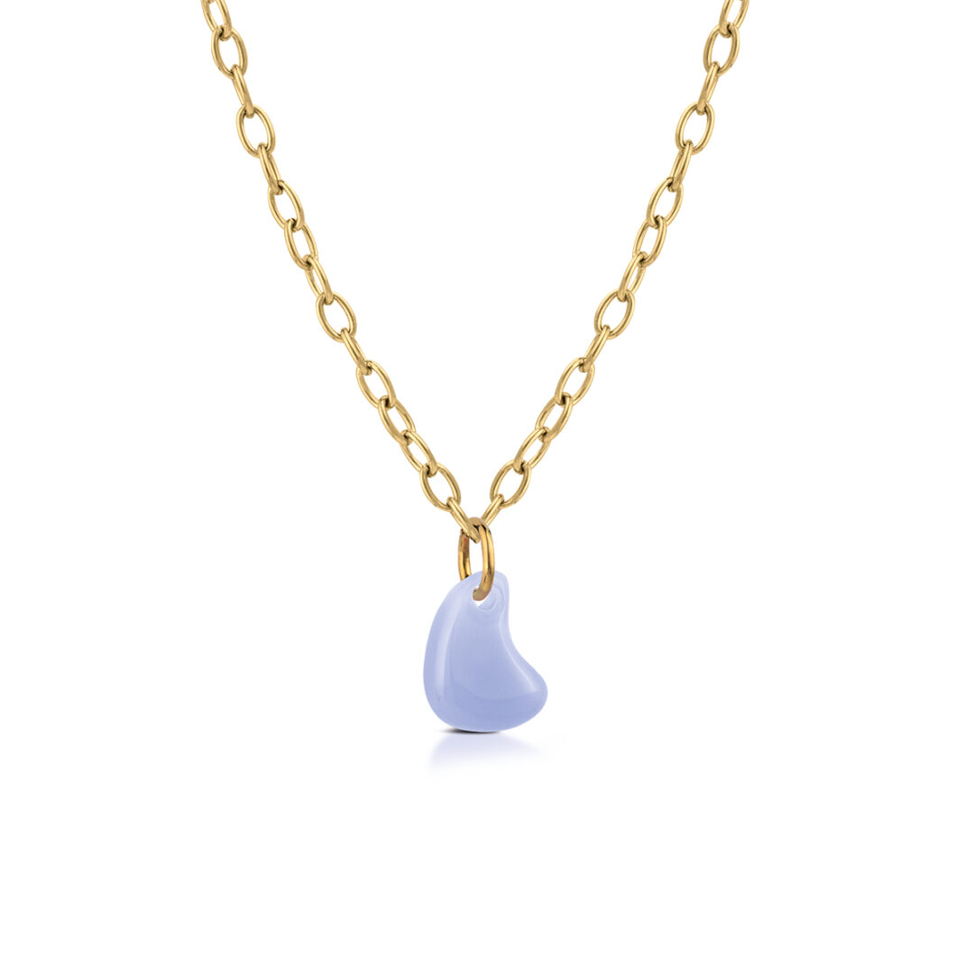 Necklace with pendant in white, pink and blue milky resin and polished steel with yellow gold PVD treatment. Cord length: 90 cm – adjustable.