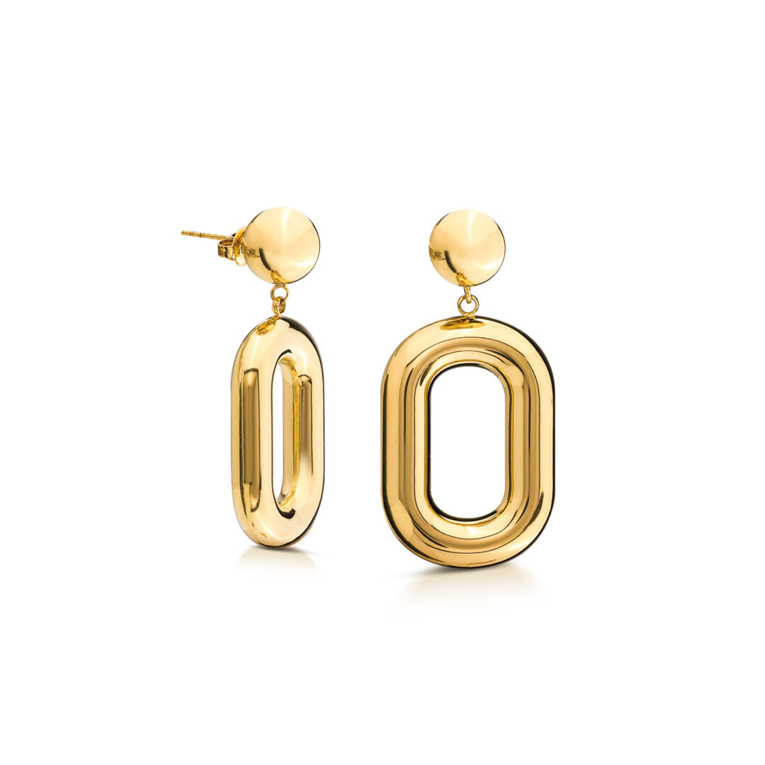 Oval steel pendant earrings with yellow gold PVD treatment. Length 5cm. Custom OPS.