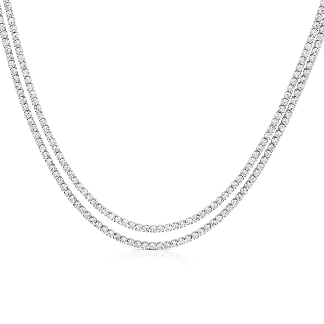 Double tennis necklace in polished steel or yellow gold PVD treatment with white stones. Stone colours: white. Necklace length: 42 cm adjustable to 45 cm.