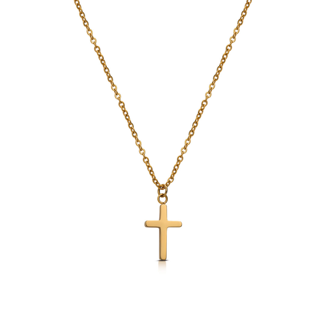 Polished steel necklace with yellow gold PVD treatment. Cross-shaped pendant. Custom OPS!. Adjustable length from 40 to 45 cm.