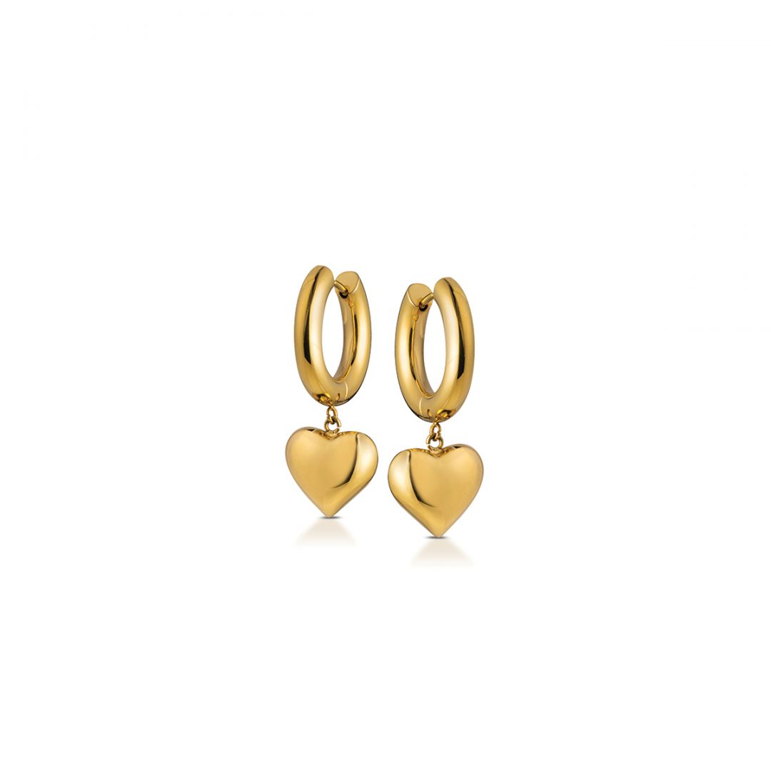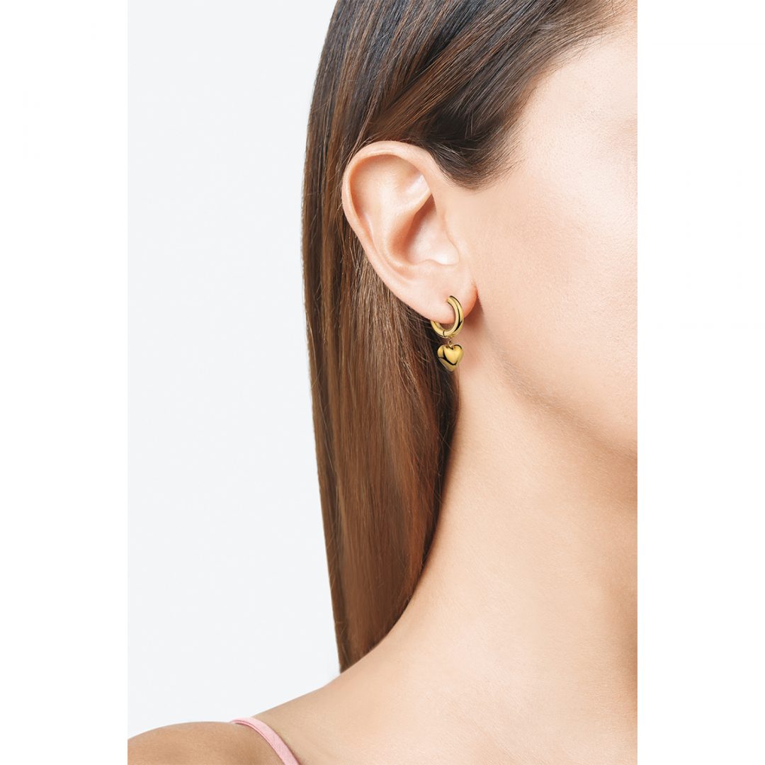 Hoop earrings with heart in polished steel with yellow gold PVD treatment.