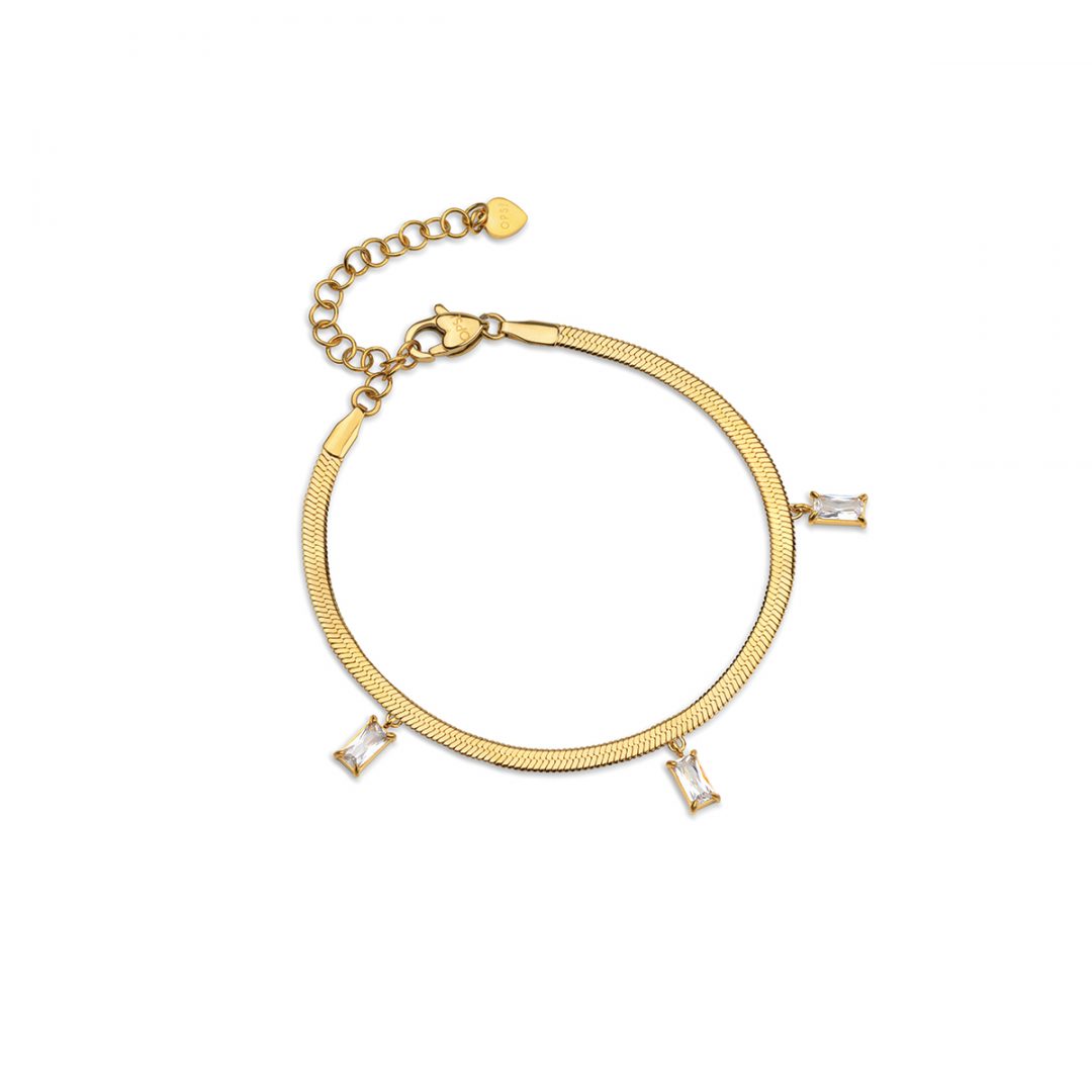 Polished steel bracelet with yellow gold PVD treatment. Personalized with OPS heart. Hanging white/purple crystals. Length 17cm adjustable to 20cm.