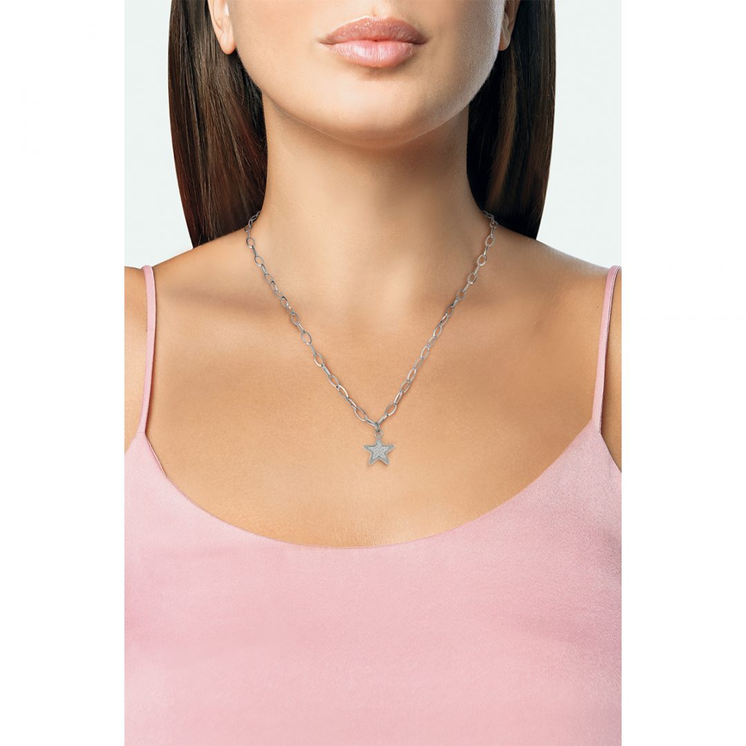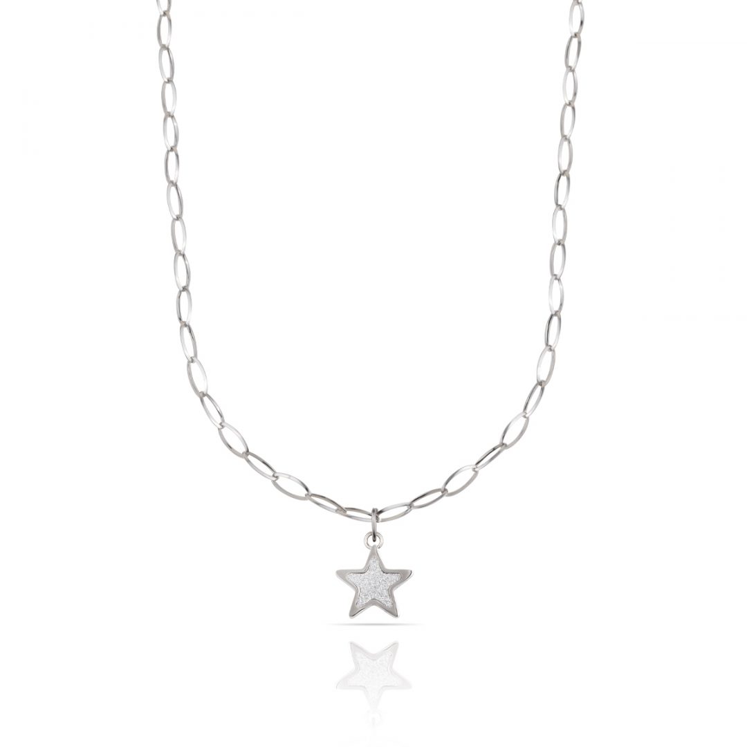Polished steel necklace. Personalized with OPS heart. Star, butterfly and smile pendant with glitter detail. Length 40cm adjustable to 45cm.