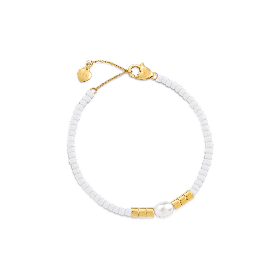 Polished steel bracelet with yellow gold PVD treatment. Custom OPS. Colored plastic beads in shades of white, turquoise, blue, pink, black and green. Length 16 cm adjustable to 18 and 20 cm.
