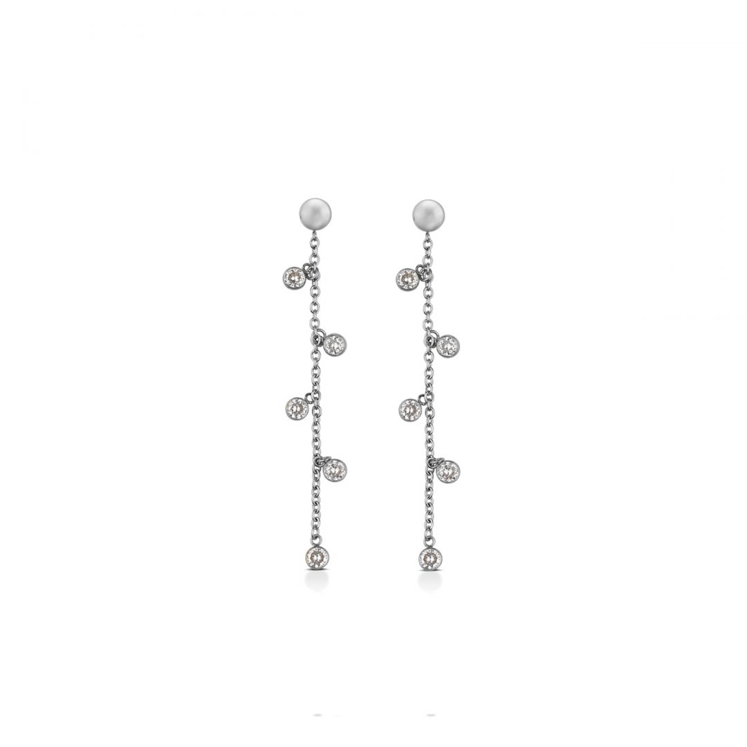 Pendant earrings in polished steel with yellow gold PVD treatment. With crystals.