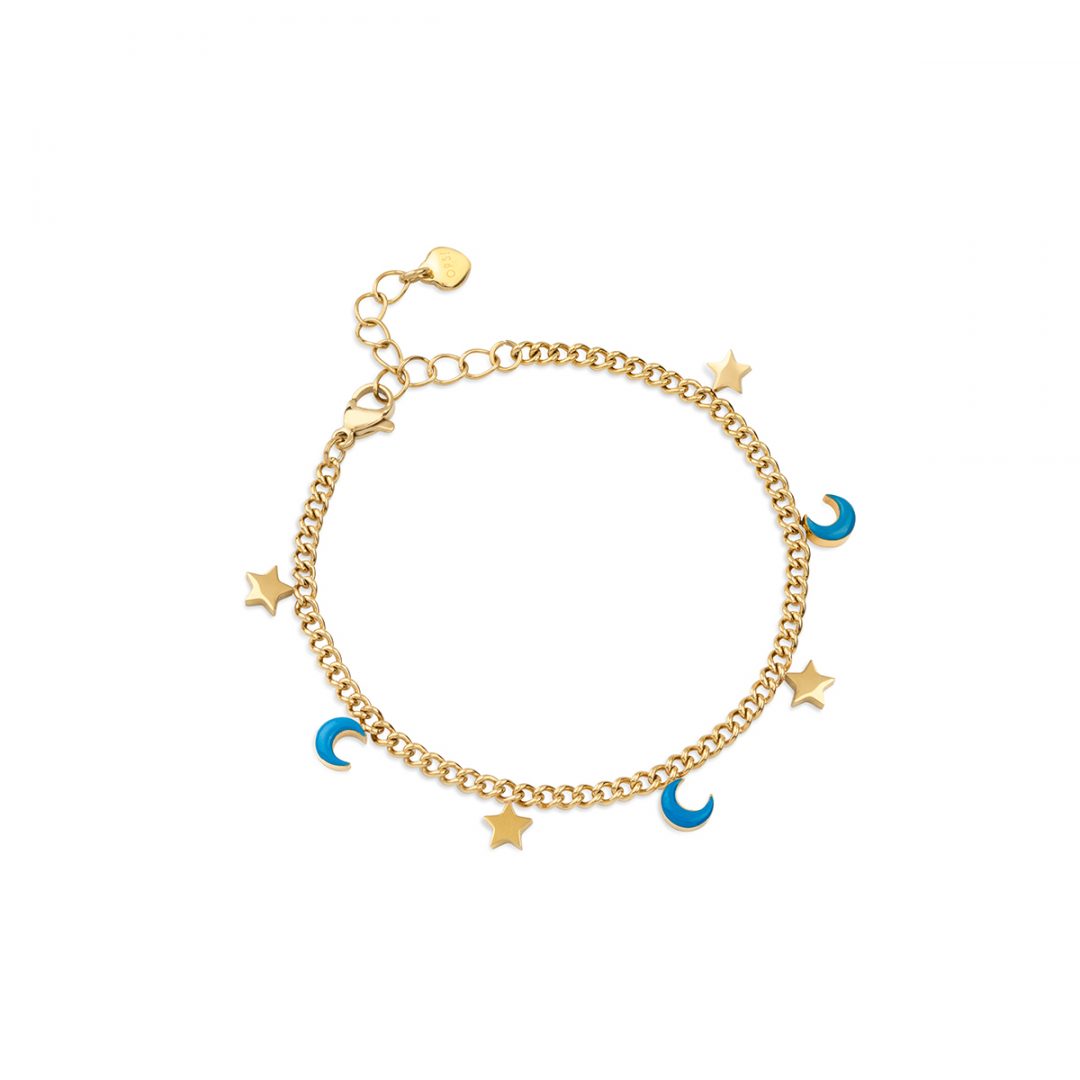 Bracelet with stars and moons charm in polished steel with yellow gold pdv treatment and enamelled in various colours. Length: 17+3 cm.