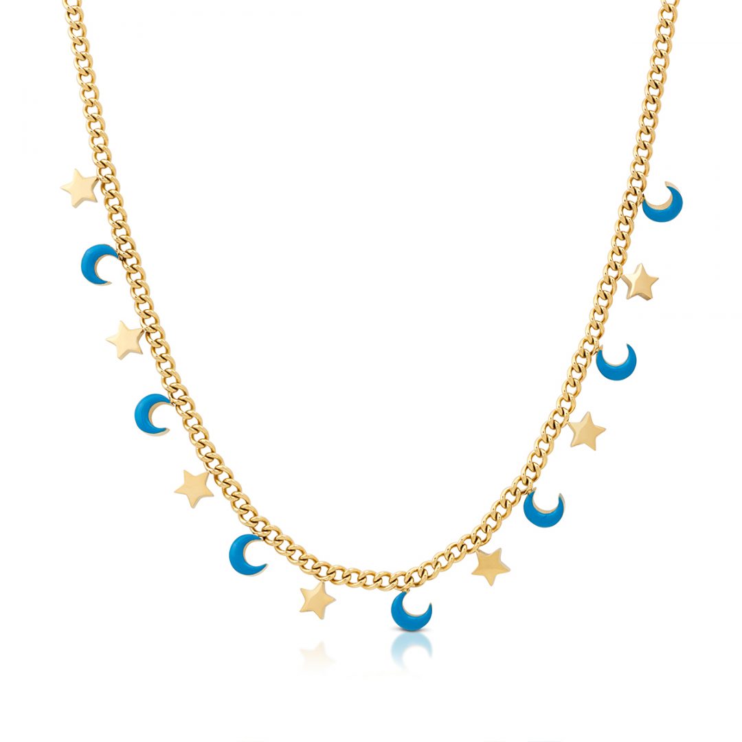 Necklace with star charm and moon charm in polished steel with yellow gold pdv treatment and colored enamel. Length: 38+5cm.
