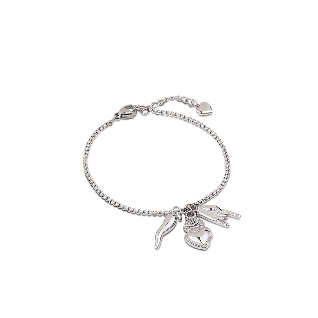 Polished steel rolo chain bracelet with three lucky charm pendants: a sacred heart, a hand, and a horn. Personalized, OPS! Adjustable length from 17 to 20 cm.
