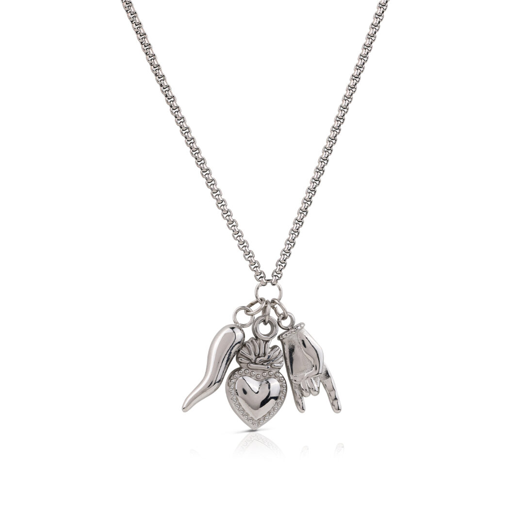 Polished steel rolo chain necklace with three lucky charm pendants: a sacred heart, a hand, and a horn. Personalized, OPS! Adjustable length from 40 to 45 cm.