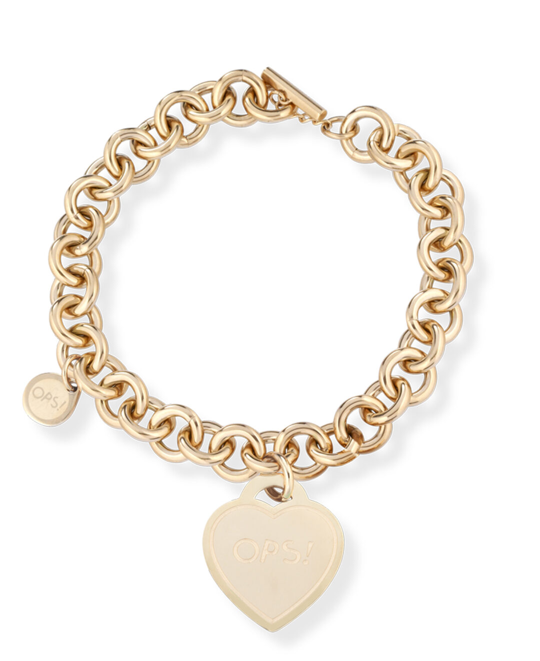 Custom polished steel chain bracelet with OPS tag, with rose gold or silver PVD treatment. Enamel heart-shaped pendant. Length 20 cm. T-bar closure.