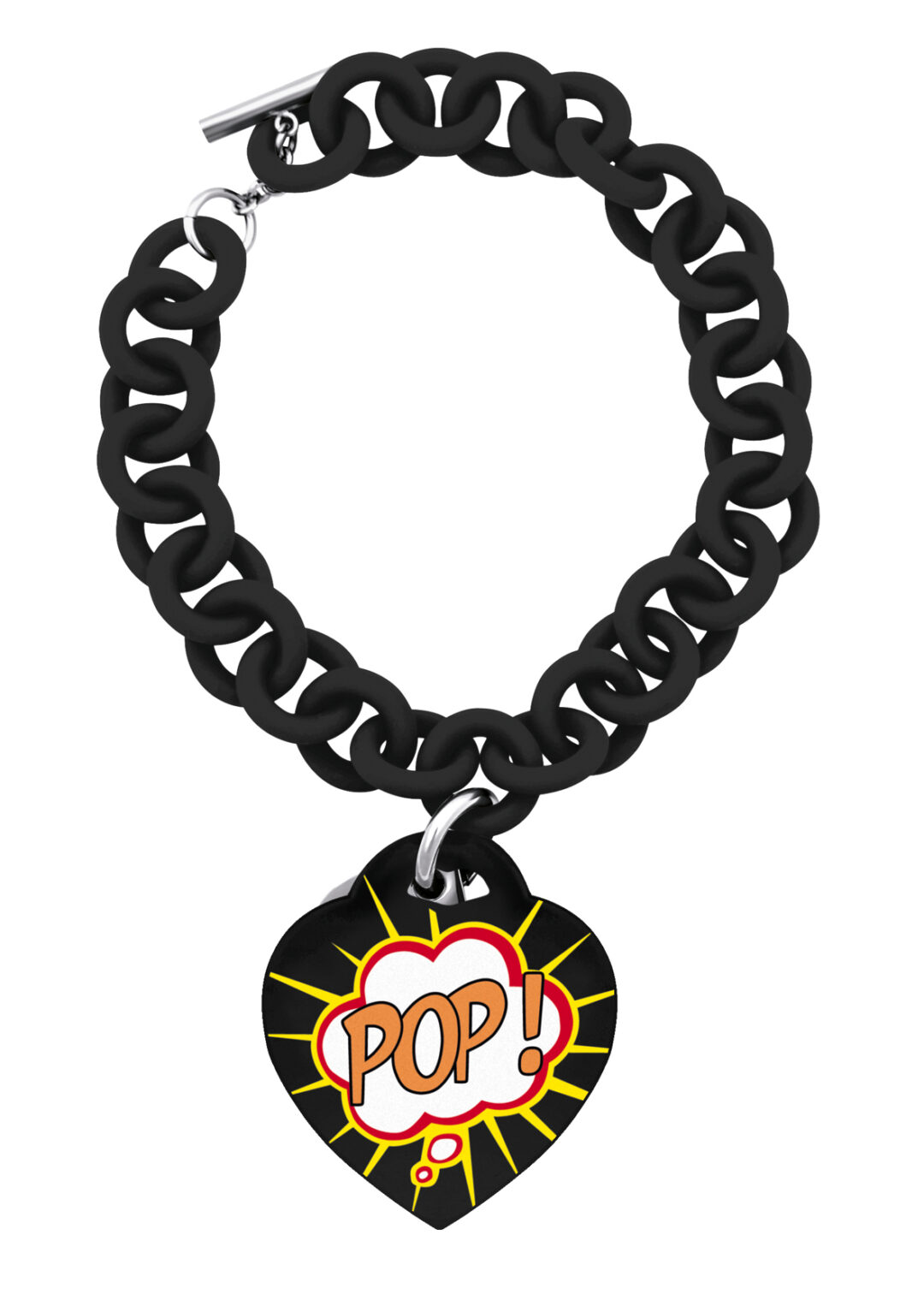 Personalized silicone chain bracelet with polished steel OPS tag. Silver / rose gold PVD treatment. Heart pendant with pop motif. T-bar closure. Length 16 cm adjustable to 20 cm.