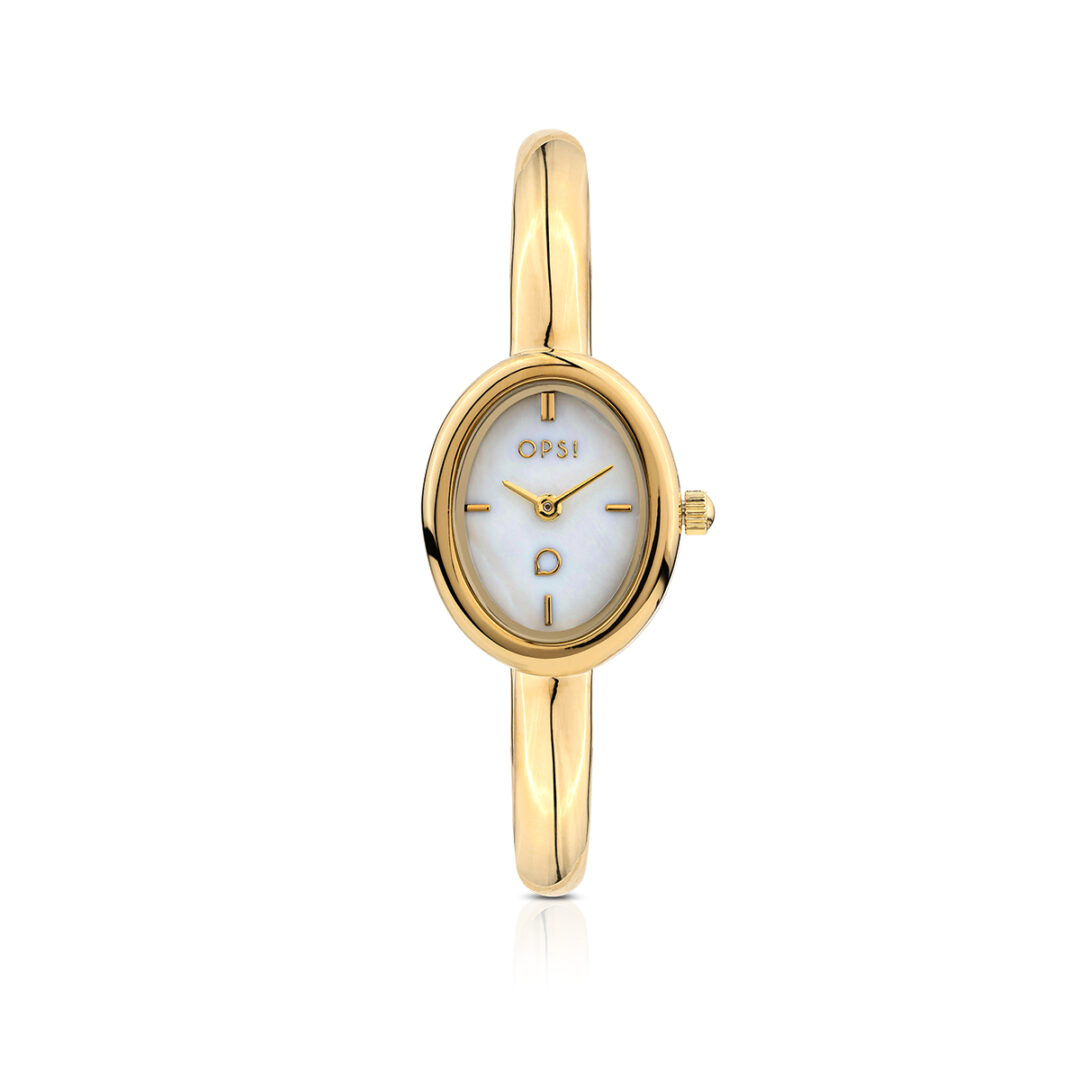 Orologio con cassa in metallo 25 mm silver e trattamento PVD oro giallo. Quadrante madreperla bianco. Vetro minerale. Fondello in acciaio. Movimento Y120. Water resistant 3 atm. Cinturino bracciale bangle in metallo e trattamento PVD oro giallo. Diametro 5,8 x 4,5 cm. Chiusura gioielleria.