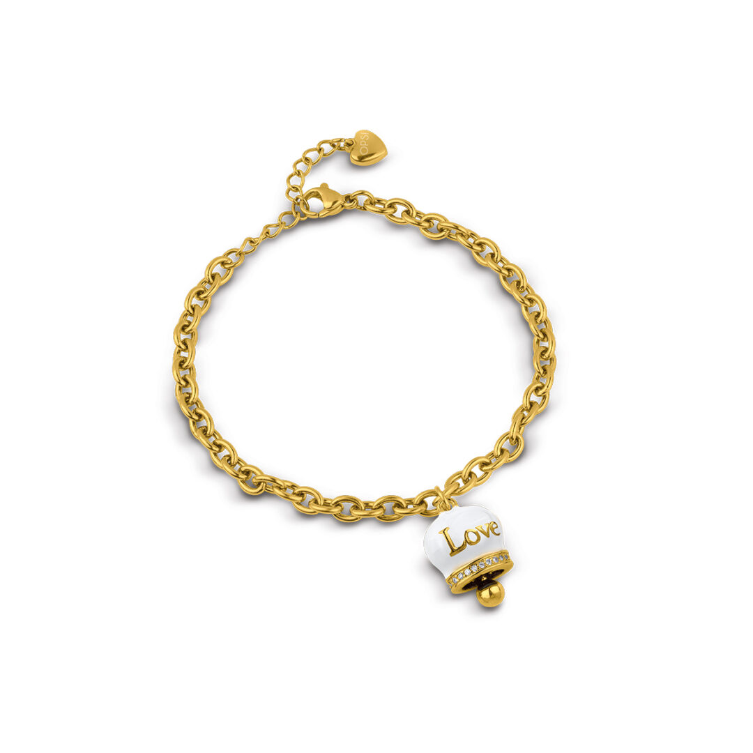 Bracciale in acciaio lucido con trattamento PVD oro giallo. Pendente a forma di campanella con cristalli e smalto bianco, nero, rosa, fucsia, azzurro e viola. Personalizzata OPS!. Lunghezza regolabile da 17 a 20 cm.