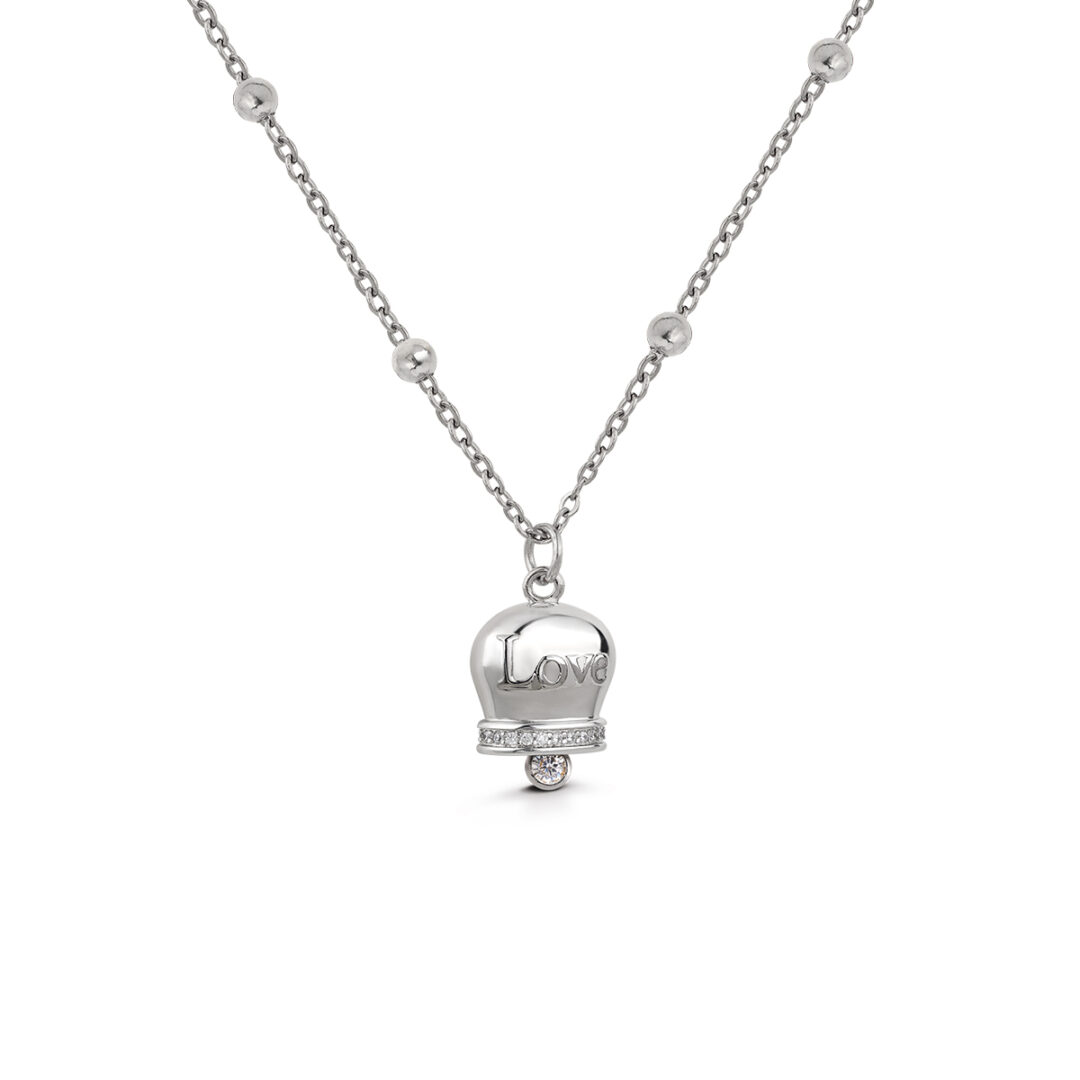 Collana in acciaio lucido con trattamento PVD oro giallo. Pendente a forma di campanella con cristalli. Personalizzata OPS!. Lunghezza regolabile da 40 a 45 cm.